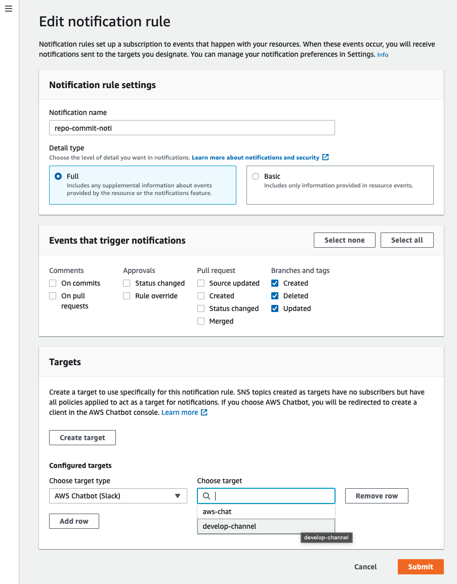 코드커밋 서비스에서 사용하는 repository 하단에 setting - notification, Create notification rule 을 구성합니다. branch 에 변경이 있을 때 앱에 알람이 오도록 설정하고 싶습니다. Target 에는 SNS Topic/ AWS Chatbot 이 가능하며, 저는 다이렉트로 chatbot 에 알람이 오도록 합니다.